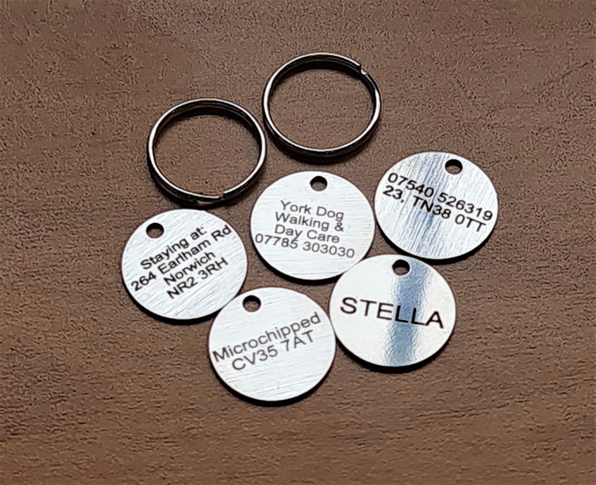 20mm diameter stainless steel pet ID tag, engraved both sides.