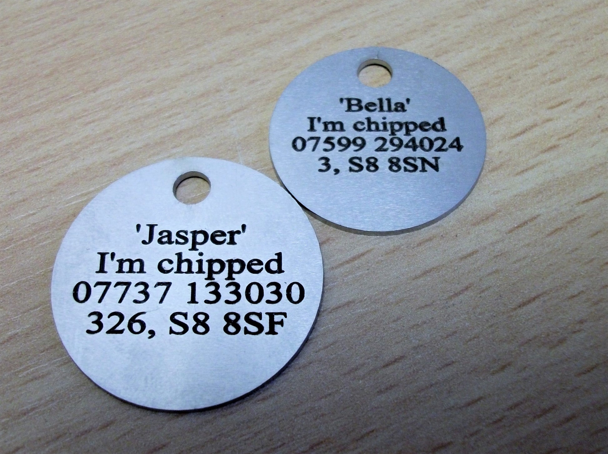 25mm diameter stainless steel pet ID tag, engraved both sides.