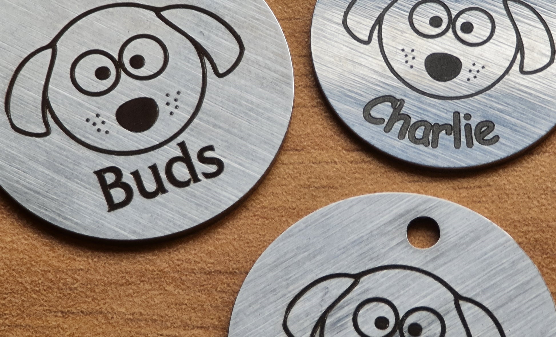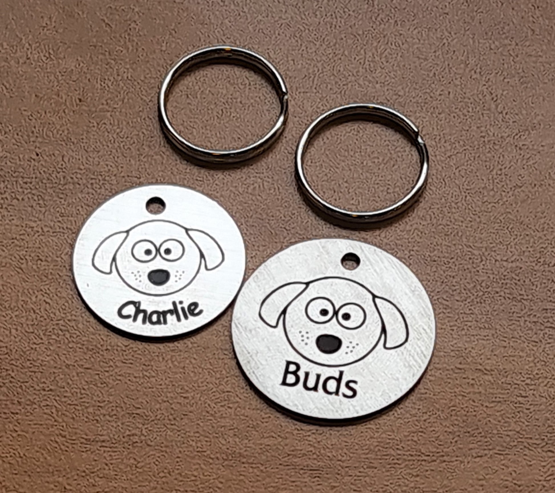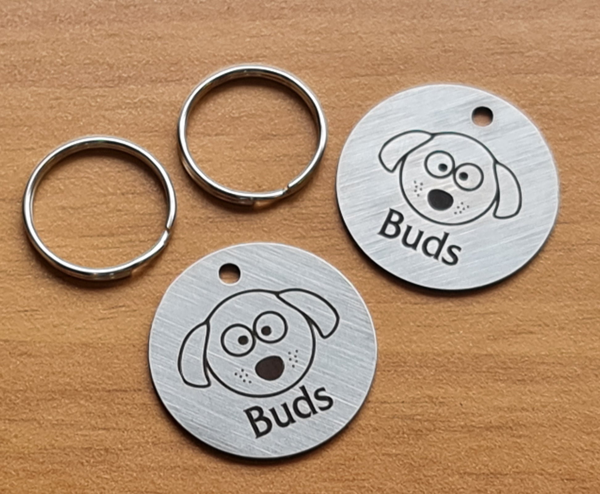 30mm diameter "Goofy Dog" stainless steel pet ID tag, engraved both sides.