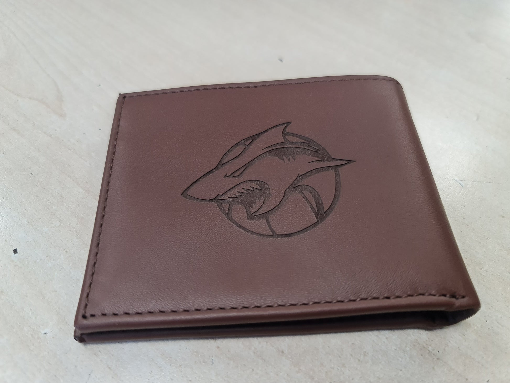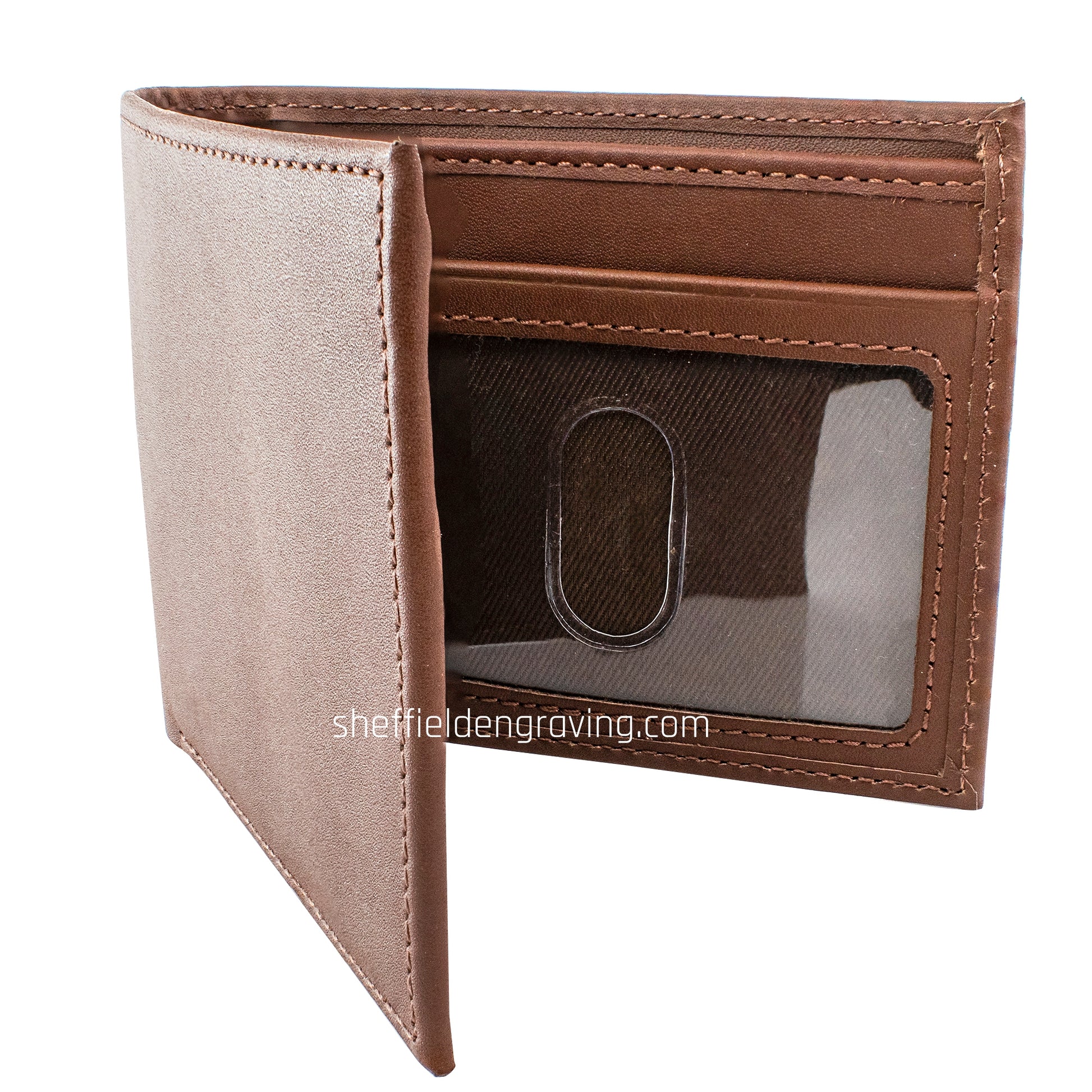 Men's genuine leather hip wallet. Custom engraved to your requirements with either text or graphics on front and back.