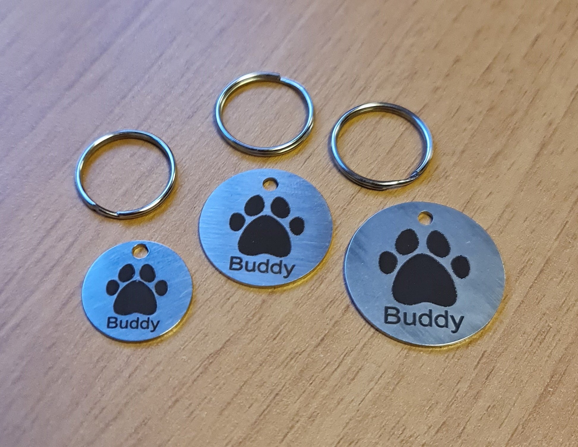 30mm diameter "Dog Pawprint" stainless steel pet ID tag, engraved both sides.