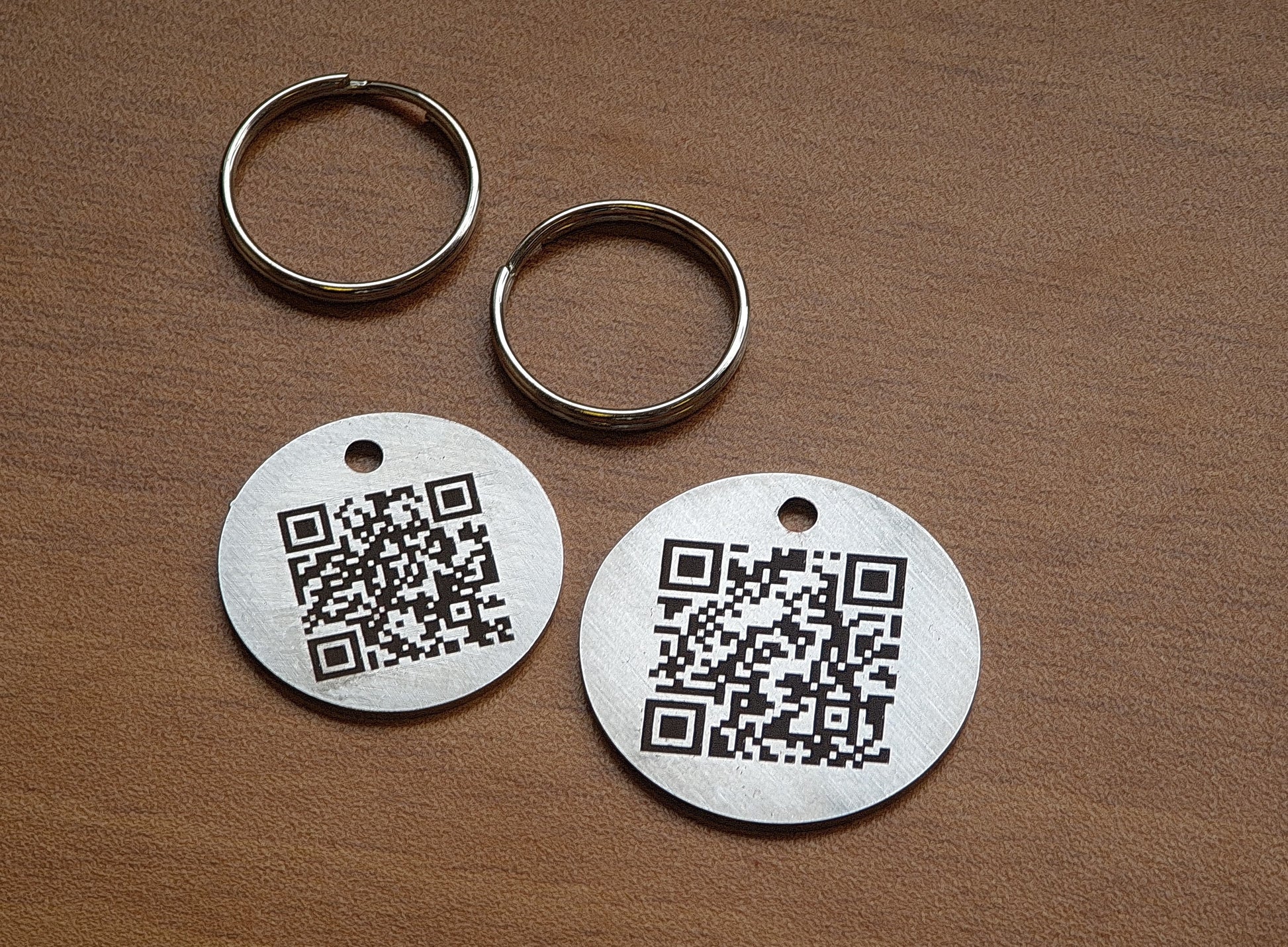 30mm diameter QR CODED stainless steel pet ID tag, engraved both sides.